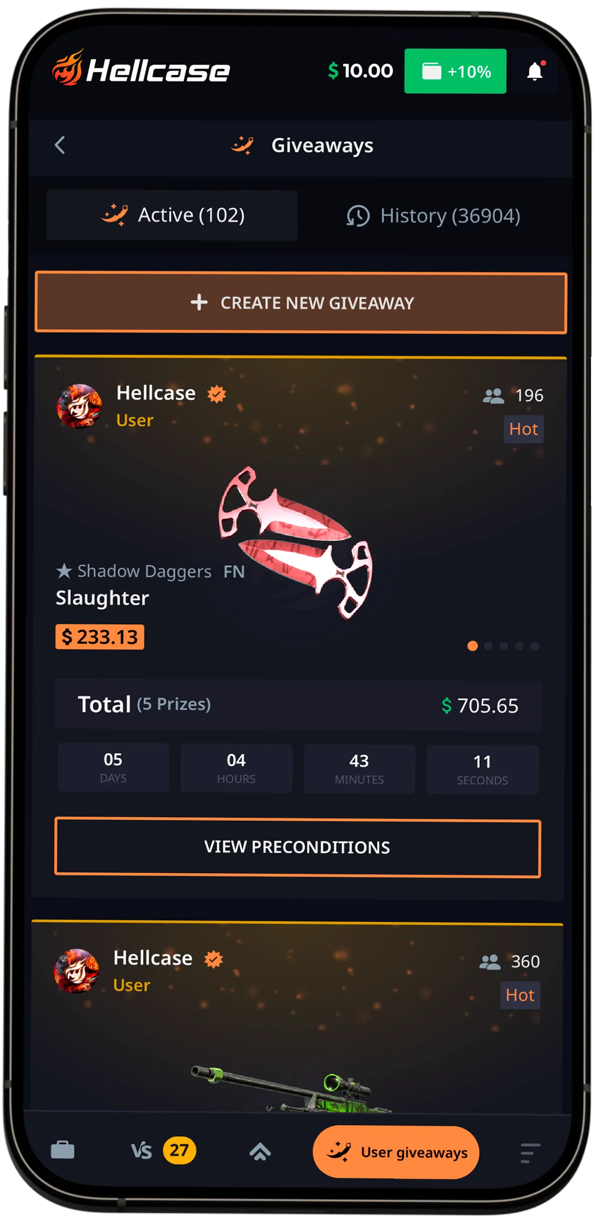 The Hellcase Case Opening Simulator App is designed by one of the most well-known platforms in the CS2 skin world. The platform offers a trustworthy brand, a smooth user interface, and frequent updates. Thousands of users trust that platform every day. Download the app now on Google Play and begin your journey into the CS2 (CS:GO) case opening process.